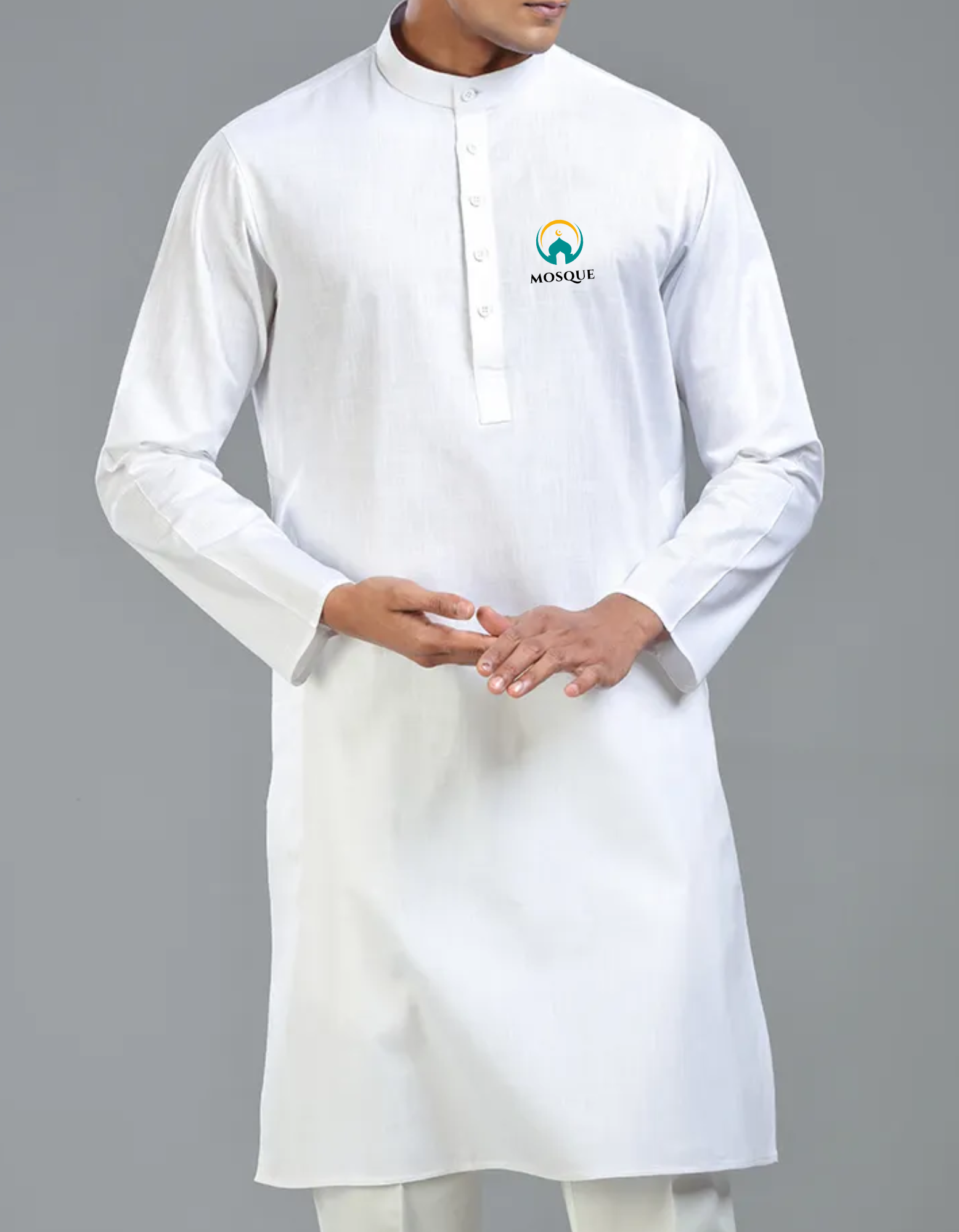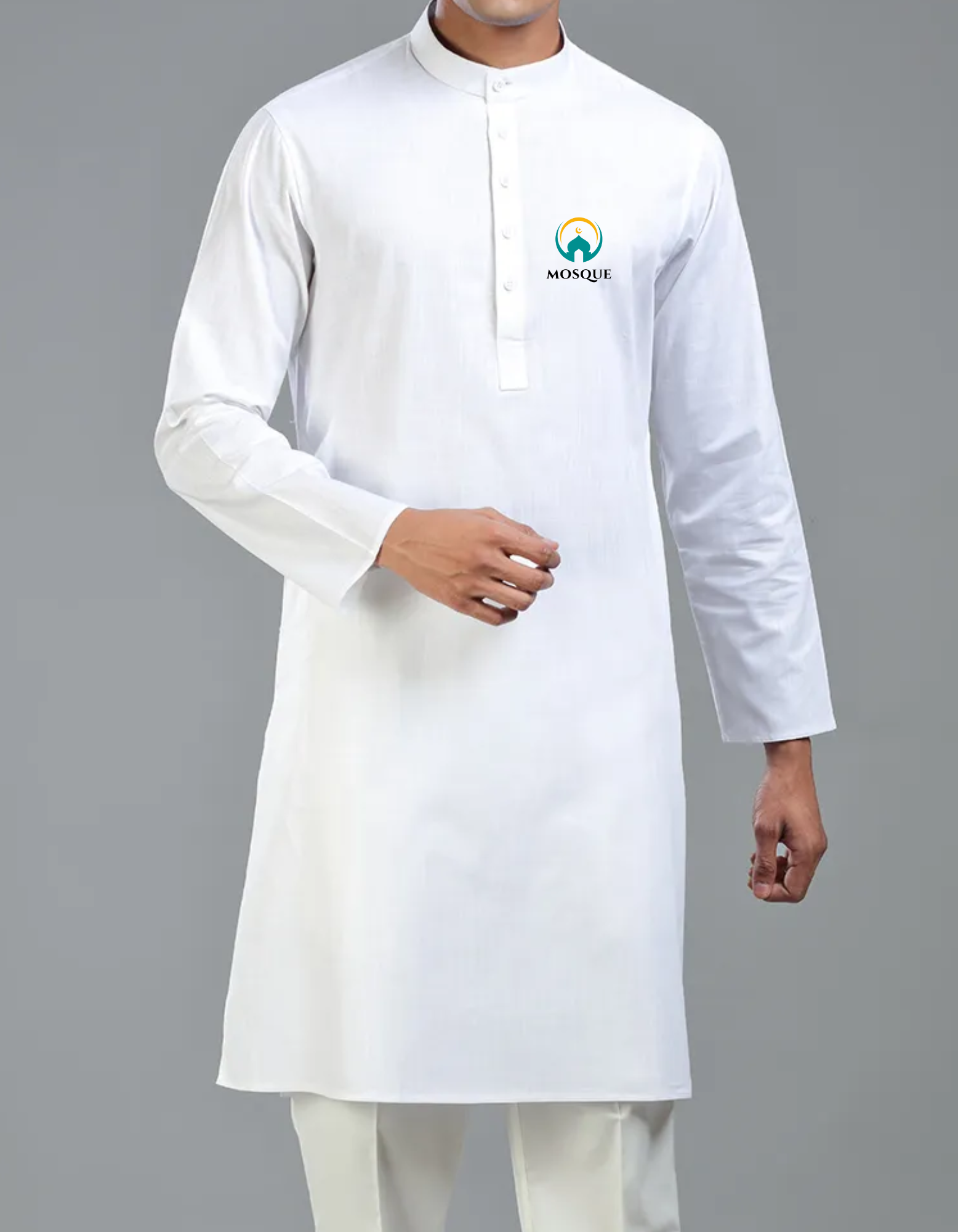 This sophisticated white kurta features a distinctive mosque logo design, perfect for religious occasions and daily wear. The traditional long-sleeve style combines modern comfort with cultural elegance. Crafted with a collarless neck and straight cut, this kurta offers excellent mobility while maintaining a dignified appearance. The versatile design pairs wonderfully with both traditional bottoms and modern denim. The pristine white colour symbolises purity and makes it an ideal choice for prayers and special gatherings. The kurta’s comfortable fit and breathable fabric make it suitable for extended wear. The chest features an artistic mosque emblem in turquoise and orange, adding a subtle yet meaningful touch to the garment. This kurta is a perfect blend of contemporary style and traditional values, making it a must-have addition to your wardrobe. For best results, gentle hand washing is recommended. Please refer to the size chart before placing your order.
